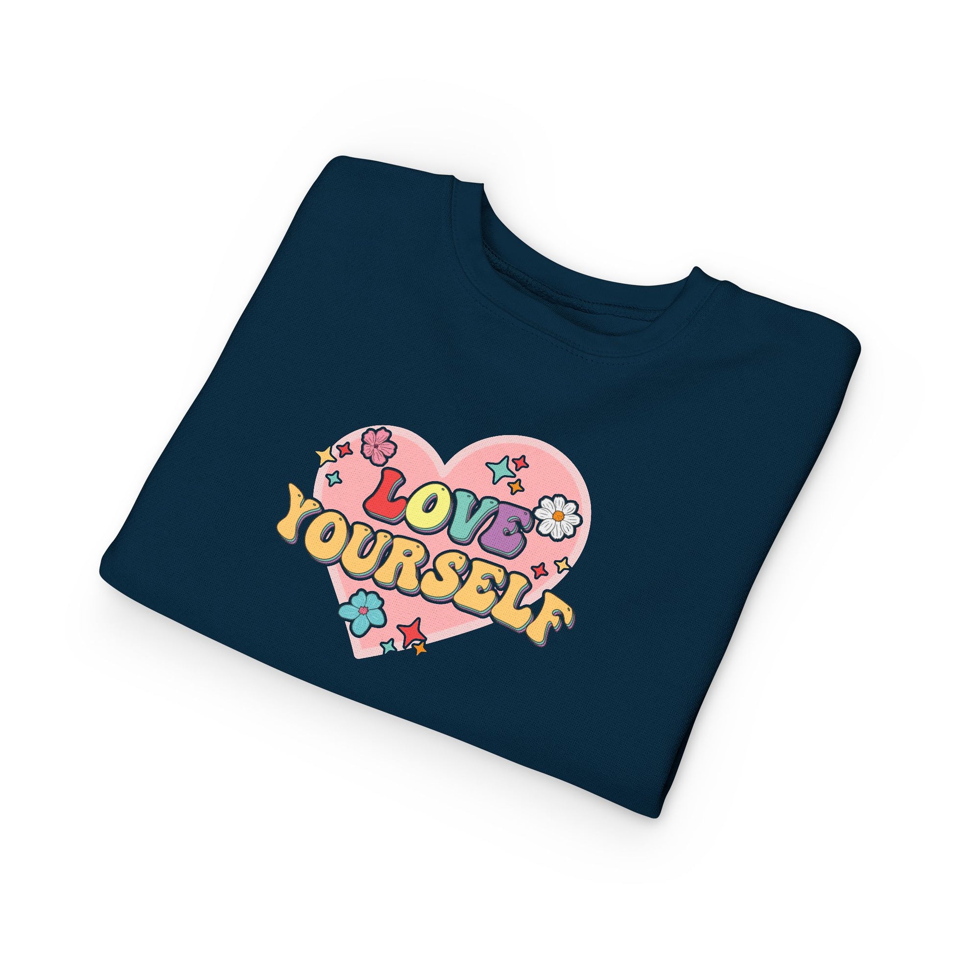 Embrace the warmth and positivity with this cozy toddler sweatshirt. Designed for comfort, it features a playful 'Love Yourself' graphic, making it the perfect addition to your little one’s wardrobe. Whether they’re playing at home, heading to preschool, or enjoying fun family outings, this sweatshirt radiates self-love and joy. It’s not just clothing; it’s a statement of empowerment for your child. Ideal for birthdays, family gatherings, and feel-good occasions, this lovable sweatshirt is tailored for kids who are ready to express themselves!