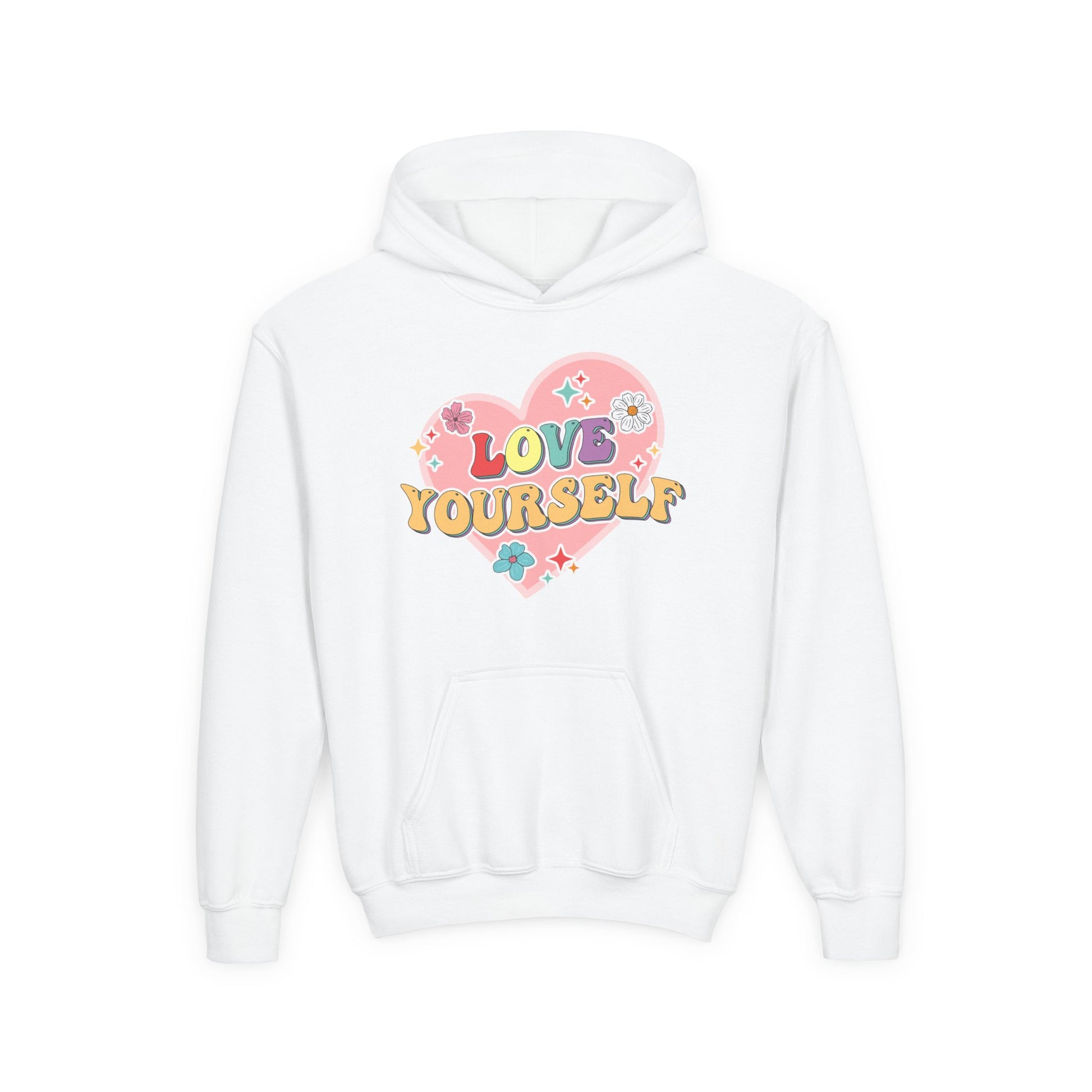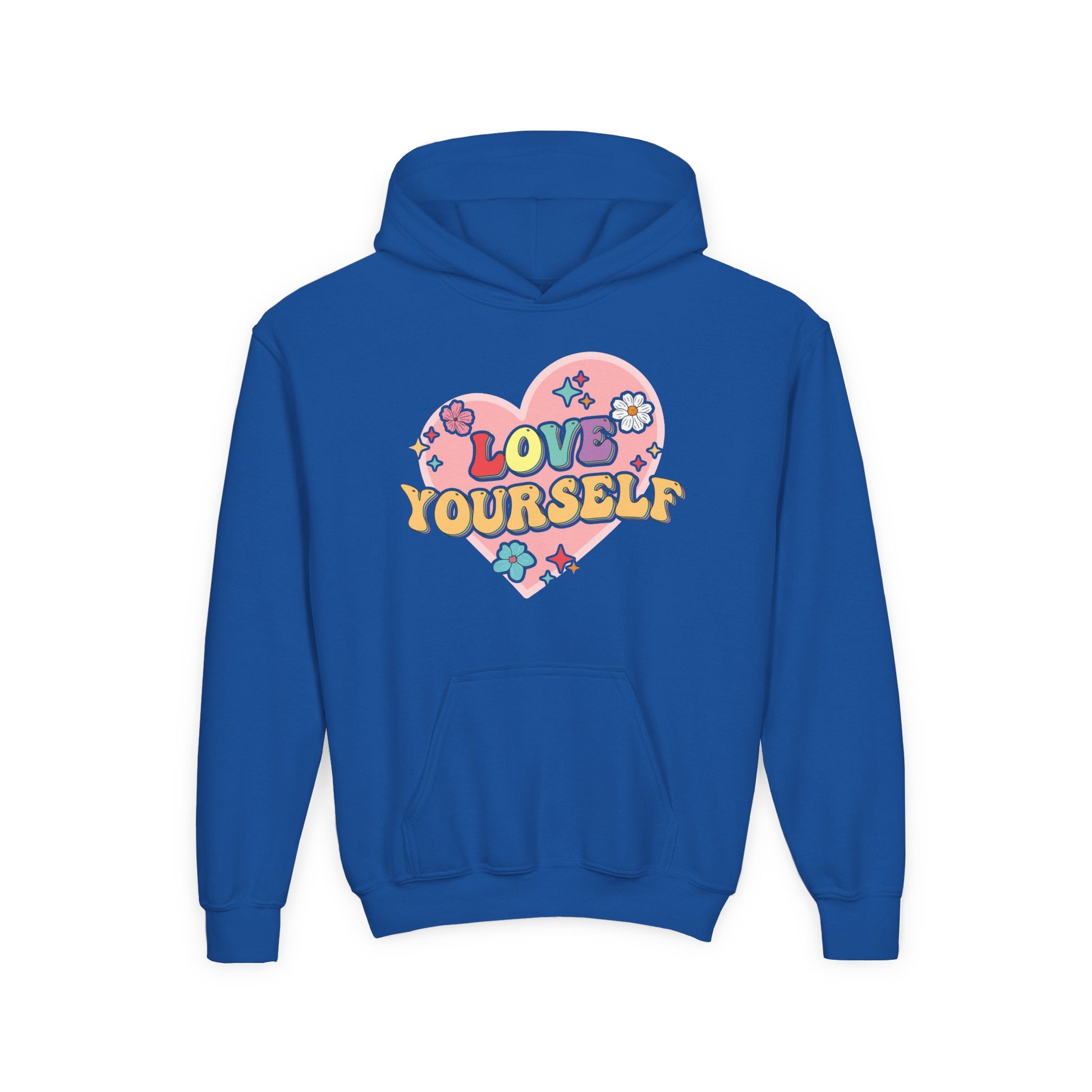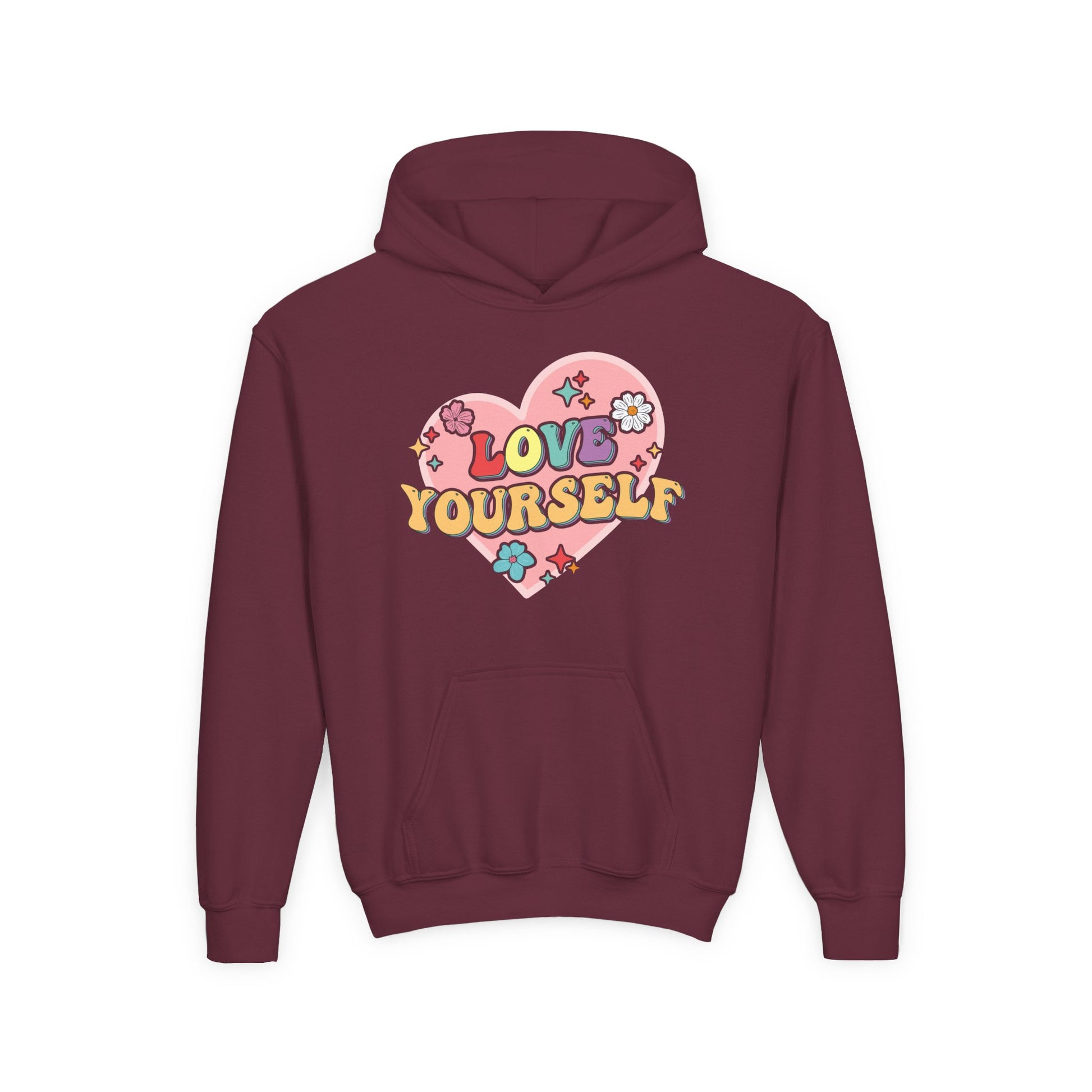 Introducing a cozy and stylish Youth Heavy Blend Hooded Sweatshirt perfect for expressing self-love and positivity. This hoodie is adorned with vibrant, cheerful designs that promote a feel-good vibe, making it a great addition to any young person’s wardrobe. It’s ideal for everyday wear, school events, and cozy hangouts with friends. Crafted with comfort in mind, the spacious kangaroo pocket keeps hands warm and provides a place to store small essentials. This sweatshirt is perfect for birthdays, family gatherings, or just as a thoughtful gift to encourage positivity. Whether it’s a chilly day or a fun outing, this hoodie brings warmth and joy to every occasion.